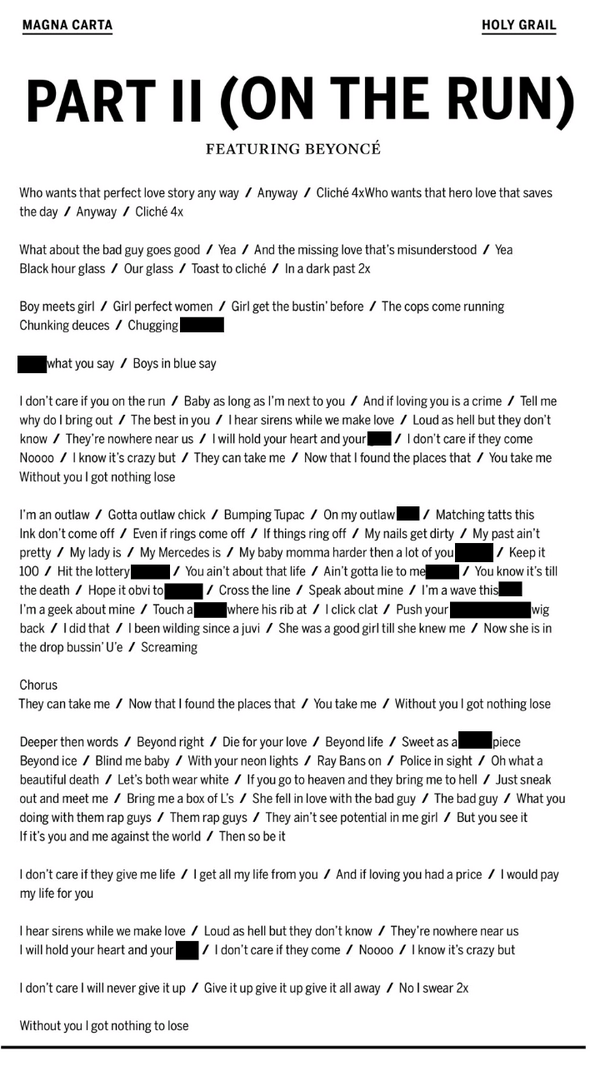 Depois de "Holy Grail" ao lado de Justin Timberlake e que trará um trecho da letra de "Smells Like Teen Spirit" do Nirvana, e "Heaven", que trás um trecho de "Losing My Religion" do R.E.M., chegou agora à internet a letra de "Part II (On The Run)".